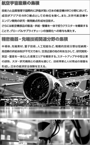 その中での核は、「産業・イノベーション」と「物流拠点」である。彼らの構想では、航空・先端産業を空港至近に誘致するとして、「航空宇宙産業の集積」と「精密機器・先端技術関連分野の集積」する計画である。これらの産業分野は、〈構想〉で「集積」と称しているように、成田空港周辺では、歴史的にも経営的にも基礎的土台がないため育たなかった産業分野である。それを国家プロジェクトで作りだそうという思惑だ。
