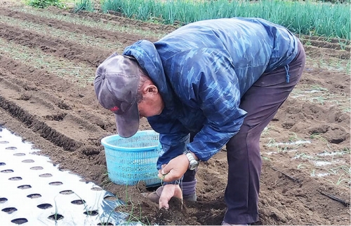 (写真 南台で玉ねぎ苗の定植を行う市東さん【11月16日】)